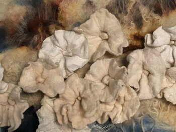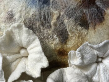 Die Natur/Blumen inspirierten sie zu diesem gefilzten Wandbehang/„Gemälde“. Es besteht aus Wolle von Merino- und Schoonebeker-Schafen. Es geht um Positivität, ein gutes Gefühl.