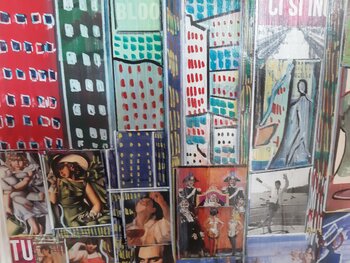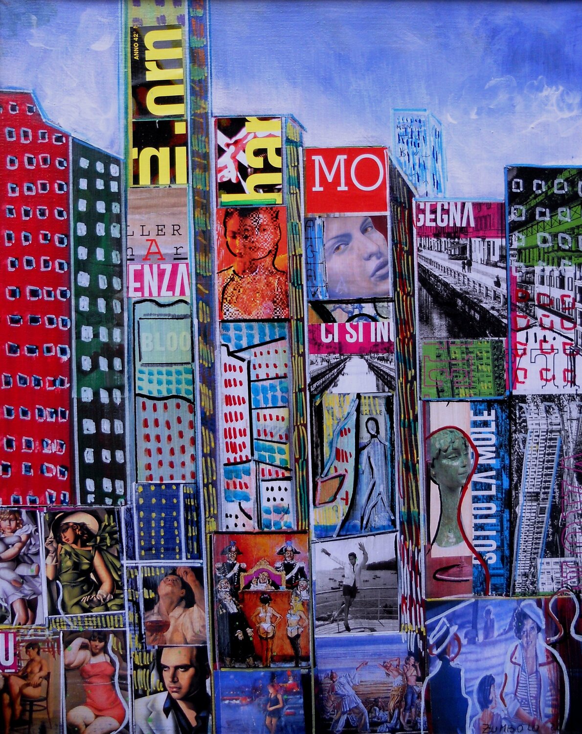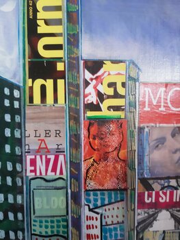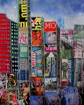 Die Arbeit ist eine gemischte Technik auf Leinwand, in Acryl mit Collage und Markierungseinsätzen bemalt. Aus dem Fahrrad Männer und Städte. Es beschreibt das Leben in einer großen Metropole. Die Werbung auf den Gebäuden scheint das wirkliche Leben der Stadt zu sein. Leute scheinen auch Werbung zu machen. Mittelformat, sehr prägnant und von großer szenischer Wirkung.
