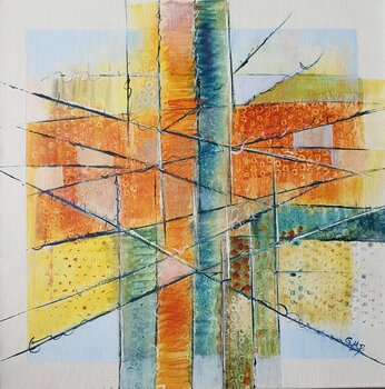 In diesem Werk verdichtet sich die Energie der Serie zu einem kraftvollen Geflecht aus Linien, Flächen und Strukturen. Die sich kreuzenden Linien stehen für Spannungen,… Richtungen und Entscheidungen, die sich überlagern und miteinander verbinden. Vertikale und horizontale Elemente schaffen Halt und Orientierung, während die diagonalen Linien Bewegung und Dynamik einbringen. Die warme, erdige Farbpalette wird von kühleren Tönen durchbrochen und erzeugt ein ausgewogenes Spiel aus Ruhe und Energie. Das Werk wirkt wie ein Knotenpunkt des Wandels – ein Moment der Sammlung, der inneren Ordnung und der bewussten Ausrichtung.