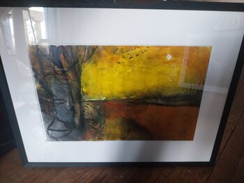 Werk ohne festen Untergrund, aber gerahmt und kann direkt aufgehängt werden.