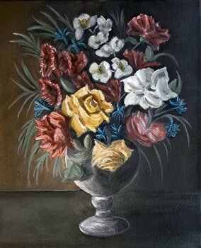 Ölgemälde, das die vergängliche Essenz der Schönheit von Blumen offenbart und Gefühle der Zartheit und Harmonie zum Ausdruck bringt.