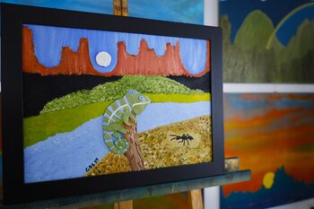 Dieses Werk entstand aus der Faszination für die Harmonie zwischen Natur und ihren kleinen, aber kraftvollen Geschöpfen. Mit Ölfarben und einem naiven Stil wollte ich die Schlichtheit und Stärke des Chamäleons und der Ameise in einer Landschaft voller Energie und Geheimnis einfangen. Ich stelle mir vor, dass dieses Gemälde Ihren Raum mit Ruhe, Neugier und einer lebendigen Verbundenheit zur Tierwelt erfüllen wird.