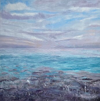 Das Interessante an dieser Meereslandschaft ist, dass der Horizont aufgrund der feuchten Luft kaum zu erkennen ist, als würden Meer und Himmel miteinander verschmelzen. Das Gemälde wurde von einem Foto inspiriert, das im Urlaub auf Zypern aufgenommen wurde. Als Gegengewicht zum unscharfen Horizont ist im unteren Teil des Gemäldes das konkretere, ja steinigere Ufer zu erkennen, verstärkt durch eine raue Textur, die durch die Beimischung von Gips zur… Farbe erreicht wird. Im Bild versteckt sind außerdem abstrakte Blasen, die Unterwasser-Luftblasen darstellen. Vor dem blauen Sommerhimmel schweben fröhlich weiße Wolken, die den Blick in die Bildmitte lenken. Beim Betrachten des Gemäldes spüren wir die Weite und das Meer, das Kunstwerk hat eine beruhigende Wirkung.