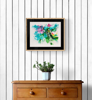 Dieses Kunstwerk auf Leinwandpapier entstand mit Acrylfarbe, einem Medium, das ich aufgrund seiner intensiven Farbbrillanz häufig verwende. Das Werk strahlt Dynamik und Poesie zugleich aus. Es zeigt eine üppige, aber nicht erdrückende Pflanzenwelt mit Blütenbüscheln und verschlungenem Laub oder Ranken, alles in einem abstrakten Stil dargestellt, der Raum für individuelle Interpretation lässt.