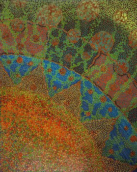 Das Bild ist farbenfroh, harmonisch und reich an kleinen Punkten, die jeweils verschiedene Elemente des Universums symbolisieren.… Jeder Betrachter kann zwischen den Punkten seine eigene, individuelle Bedeutung entdecken. Entstanden ist das Werk in einem sehr intensiven, kreativen Arbeitsprozess.