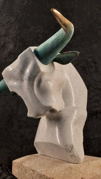 In dieser Skulptur wollte ich die rohe Kraft und Noblesse des Stiers einfangen und die Kälte des Marmors mit der Wärme der Bronze und der Festigkeit des Steins verbinden. Jedes Material bringt eine einzigartige Schwingung mit sich und schafft einen Dialog zwischen Stärke und Sanftheit. Dieses Werk verkörpert die dominante Energie, die Ihren Raum belebt und Mut und Widerstandsfähigkeit im Alltag inspiriert.