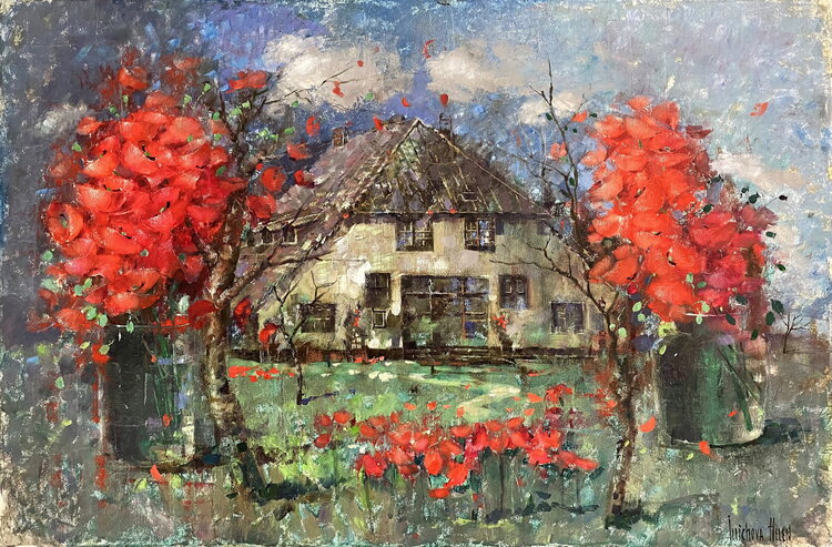 In diesem Gemälde habe ich meine Liebe zu ruhigen, warmen Rückzugsorten inmitten der strahlenden Natur zum Ausdruck gebracht. Die feurigen Mohnblumen symbolisieren pulsierendes Leben und Hoffnung und bilden einen Kontrast zur ruhigen Hütte, die Trost spendet. Ich wollte einen Moment einfangen, in dem Energie und Frieden miteinander verschmelzen und jeden Raum mit herzlicher Wärme und nostalgischem Charme erfüllen. Dieses Kunstwerk lädt Sie ein, Ruhe… und Freude zugleich zu atmen.