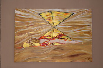 In diesem Gemälde nutze ich Acrylfarben, um eine surreale Landschaft zu erschaffen, die Energie und Bewegung verkörpert. Die Szene zeigt eine Figur, die sich mit der Natur verschmilzt, wobei Elemente wie Wind und Erde dramatisch zusammenfließen. Meine Inspiration stammt aus der Kraft und Unvorhersehbarkeit der natürlichen Welt, die ich als visuelles Echo menschlicher Emotionen darstelle. Dieses Kunstwerk soll den Betrachter dazu anregen, über die… Verbindung zwischen Mensch, Energie und Natur nachzudenken und dabei eine tiefe, emotionale Resonanz zu erleben. Die Hingabe an die schöpfende Macht. Das spüren von der Energie in uns. Der Hintergrund bewegt sich bei der Betrachtung aus der Ferne..