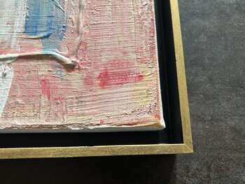 Das Gemälde ist auf Leinwand gearbeitet, mit hochwertigen Künstlermaterialien ausgeführt und durch einen schützenden Firnis veredelt. Es ist in einem schwarzen Schattenfugenrahmen mit dezenter Goldkante gefasst und sofort aufhängbar.