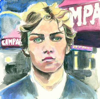 Jakob Arjouni hat bereits im Alter von 21 Jahren seinen ersten Kriminalroman geschrieben, es folgen weitere, und 1992 erhielt Arjouni den Deutschen Krimipreis. Das Aquarell zeigt ihn als jungen Mann, der Ausdruck des Gesichts ist selbstbewusst und klar. Im Hintergrund wird ein pulsierende Stadtszene angedeutet. Durch die lebendigen Farben wird eine dynamische Spannung erzeugt, die Darstellung des Lichts lässt das Bild warm wirken.