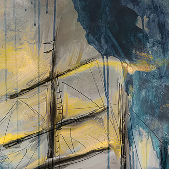 Der erste verbürgte Stapellauf eines Schoners fand 1713 in Gloucester (etwa 50 km nordöstlich von Boston) statt. Ein Zuschauer soll beim Stapellauf vermerkt haben: „There she scoons“ oder „Oh, see how she scoons“ („Da gleitet sie hin“ bzw. „Oh sieh, wie sie gleitet“). Der Erbauer dieses Schiffes, ein Kapitän Andrew Robinson, habe dann das Wort „Schooner“ geprägt. Seine Bezeichnung stammt von einem Verb aus dem schottischen Clydesdale-Dialekt ab:… „to scoon“ (etwa „Steine übers Wasser gleiten lassen“, auch „gleiten“). Das Bild ist zur Hälfte analog und zur Hälfte digital gemalt, dann digital zusammengeführt auf Leinwand, auf einem 4 cm starken Keilrahmen und auf der Rückseite ein stabiles Holzkreuz montiert, zum Schluss mit Acrylfarbe veredelt. Schritte/Arbeitsweise: Analog, Digital, Analog. Ein Unikat.