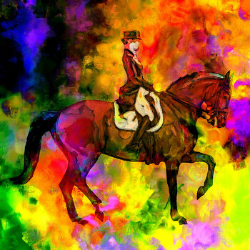 Die Reiterin, anmutig und diszipliniert reitet Sie ihren Parkour, immer den Sieg im Auge. Das Bild ist zur Hälfte analog und zur Hälfte digital gemalt, dann digital zusammengeführt auf Leinwand, auf einem 4 cm starken Keilrahmen und auf der Rückseite ein stabiles Holzkreuz montiert, zum Schluss mit Acrylfarbe veredelt. Schritte/Arbeitsweise: Analog, Digital, Analog. Ein Unikat.