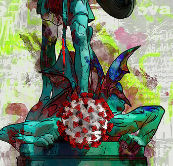 Der neue Status Quo wird hoffentlich die Vernichtung des Covid Virus werden und das die Menschheit wieder aufatmen kann. Das Bild ist zur Hälfte analog und zur Hälfte digital gemalt, dann digital zusammengeführt auf Leinwand, auf einem 4 cm starken Keilrahmen und auf der Rückseite ein stabiles Holzkreuz montiert, zum Schluss mit Acrylfarbe veredelt. Schritte/Arbeitsweise: Analog, Digital, Analog. Ein Unikat.
