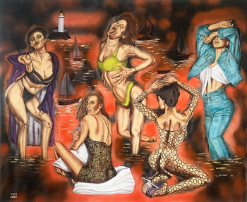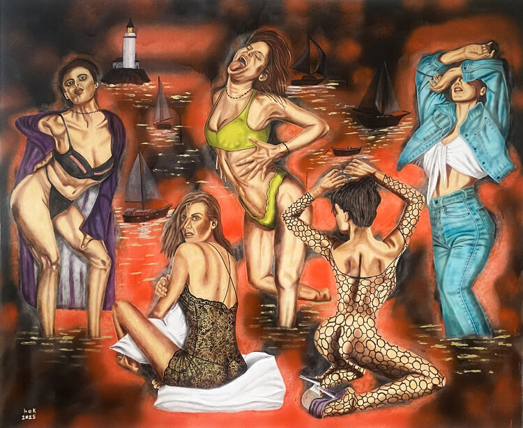 Ich wollte Themen wie Stärke, Freiheit und Selbstdarstellung erforschen. Jede Frau ist in einer individuellen Pose dargestellt und fängt individuelle Geschichten und Emotionen ein. Die vielseitige Kleidungswahl repräsentiert unterschiedliche Identitäten und die Vielschichtigkeit der Weiblichkeit. Der leuchtend rot-schwarze Hintergrund mit Elementen wie dem Leuchtturm und den Booten suggeriert eine Verbindung zwischen den Figuren und dem Meer – ein… Symbol für Weite und Entdeckungsreise. Diese Kulisse verstärkt das Gefühl von Bewegung und Abenteuer. Insgesamt zielt das Gemälde darauf ab, Schönheit und Kraft zu zelebrieren und eine dynamische Erzählung zu schaffen, in der jede Figur einen anderen Aspekt von Stärke und Individualität verkörpert.