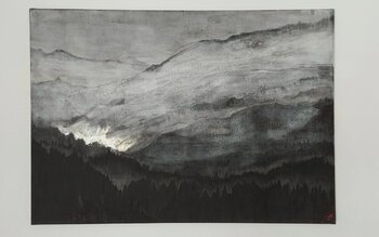 In diesem Werk wollte ich die stille Kraft des nebelverhangenen Berges einfangen. Mit Tusche und Pigmenten schuf ich einen eindrucksvollen Kontrast zwischen Schatten und Licht und hob so die geheimnisvolle Tiefe der Landschaft hervor. Diese Welt lädt zum Nachdenken ein und verleiht Ihrem Raum eine beruhigende und introspektive Atmosphäre.