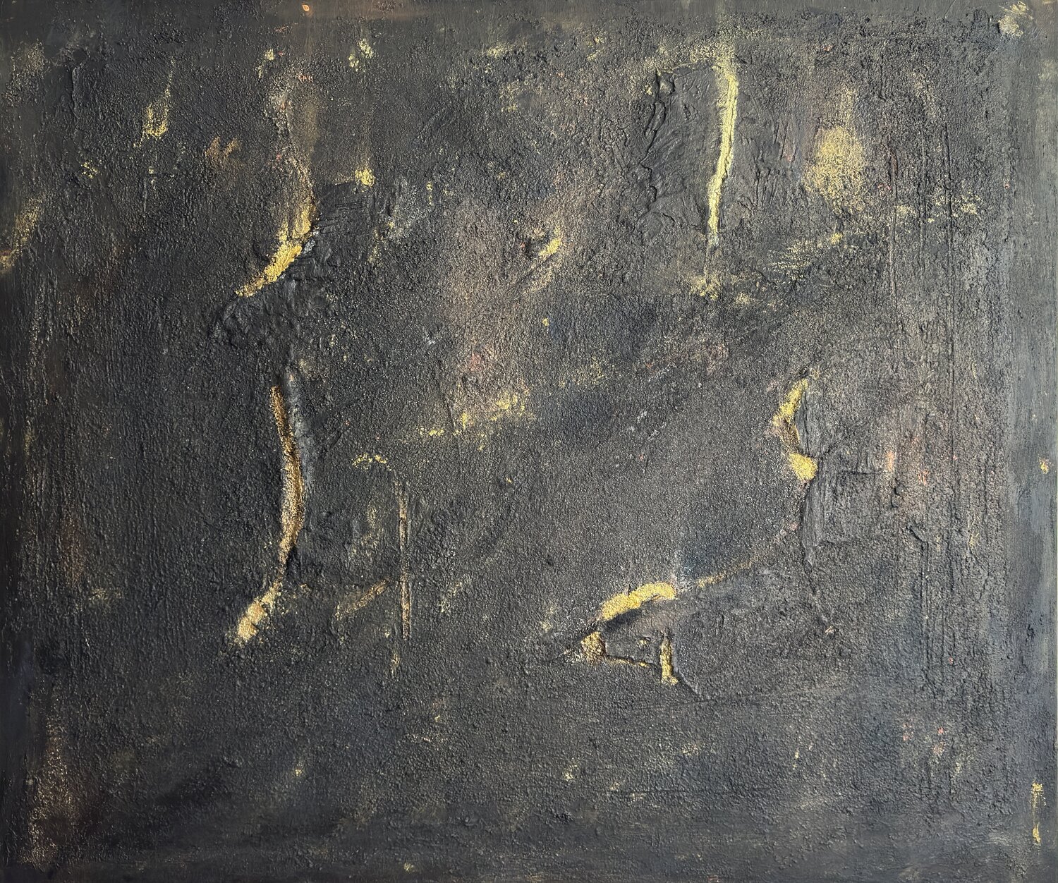 Echoes of the Unknown ist eine Reflexion über das Unbewusste, das Vergangene und das Unerklärliche. Schemenhafte Figuren scheinen aus der Tiefe des Bildes aufzutauchen, gezeichnet von goldenen Spuren, die wie Erinnerungen in der Dunkelheit flackern. Die rohe, fast archaische Textur verleiht dem Werk eine geologische Qualität – als ob es aus einer verborgenen Schicht der Zeit gehoben wurde. Es lädt den Betrachter ein, die Grenzen zwischen Realität… und Vorstellungskraft zu hinterfragen.