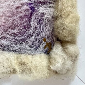 Das Bild ist eine Naturaufnahme mit der Polaroidkamera. In einem von mir entwickelten Verfahren wurde das Polaroid aus seinem Entwicklungsrahmen gelöst. Das transparent gewordene Polaroid dann weiter bearbeitet und auf einen neuen Träger geklebt. Danach mit Wollfasern kombiniert. Das so entstandene Objekt wurde erneut abfotografiert. Dann digital leicht bearbeitet und auf Leinwand mit Keilrahmen in Schattenfugenrahmen aus Kunststoff ausgedruckt.… Die Fugen des Rahmens habe ich mit Kügelchen aus Roh-Wolle ausgefüllt. Das Kunstwerk kann für sich alleine stehen oder wird kombiniert zu einem Altar, welcher aus 10 Bilder besteht. Durch die spezielle Behandlung ist das Werk ein Original. Es wird gegebenenfalls zu Ausstellungszwecken einen Prototyp geben, dieser verbleibt dann unverkäuflich in meinem Besitz.