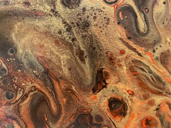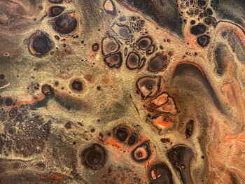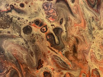 Dieses Kunstwerk im Format 29 x 29 cm besticht durch seine kraftvolle Farbkomposition, in der Rot und Gold dominieren und sich mit Akzenten in Schwarz verbinden. Die Farben fließen organisch ineinander und bilden eindrucksvolle, großflächige Zellstrukturen, die dem Werk eine faszinierende Tiefe und Lebendigkeit verleihen.