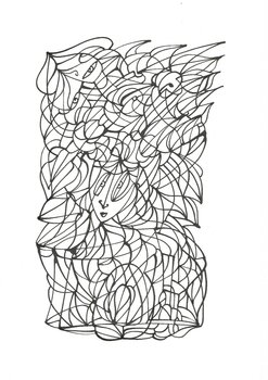 Diese Zeichnung lebt von Kontrasten zwischen dichtem Liniengeflecht und offenen Flächen. Die Figur wirkt zugleich geschützt und verletzlich. Ich begreife sie als Resonanzraum für Ambivalenz – für Zustände, die sich nicht eindeutig festlegen lassen.