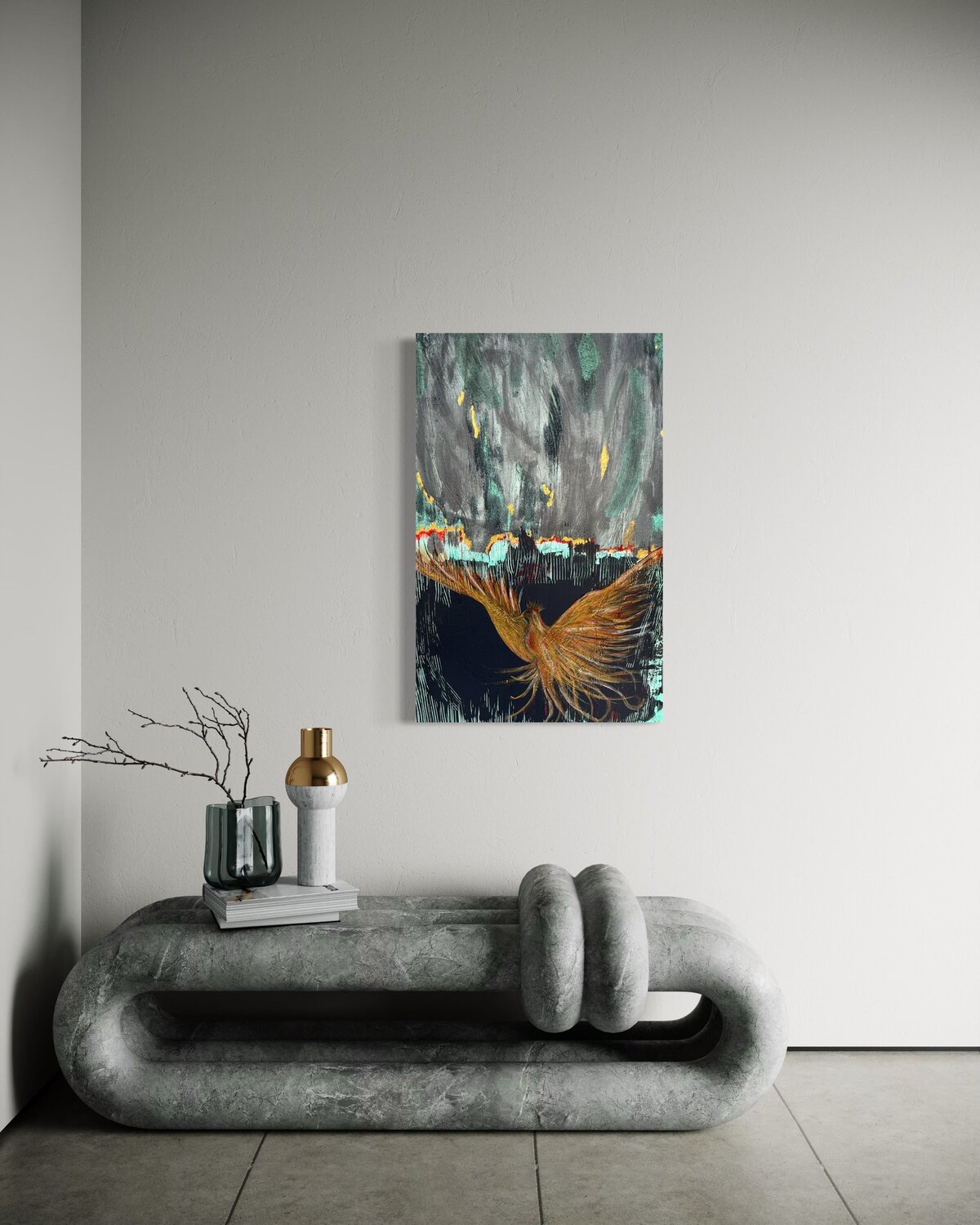 In diesem Acrylgemälde habe ich das kraftvolle Thema Wiedergeburt und Widerstandsfähigkeit anhand der lebendigen Darstellung eines Phönix aus der Dunkelheit erkundet. Die ausdrucksstarken Pinselstriche und die kontrastierenden Farben fangen die dynamische Energie und den Triumph des Geistes ein. Dieses Werk verkörpert Hoffnung und Erneuerung und soll Kraft und Mut im Angesicht von Widrigkeiten wecken. Es bringt eine lebendige, erhebende Energie in… jeden Raum und bestärkt den Betrachter mit seiner wilden Schönheit und der symbolischen Botschaft des Neuaufstiegs.