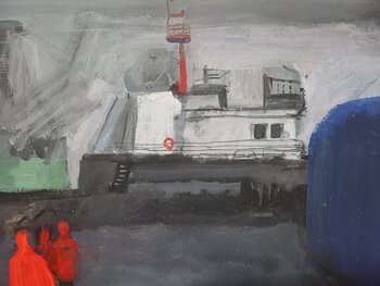 In diesem Ölgemälde verflechte ich expressionistische und impressionistische Elemente, um die kraftvolle Atmosphäre eines belebten Hafens darzustellen. Die lebendigen roten Figuren kontrastieren mit den gedämpften Grautönen des schweren Frachtschiffs und der umgebenden Infrastruktur, symbolisierend die menschliche Energie im Zusammenspiel mit der massiven, oft übersehenen mechanischen Kraft des Hafenlebens. Durch die dynamische Komposition möchte… ich die Betrachter emotional in das pulsierende Herz des Hafens ziehen.
