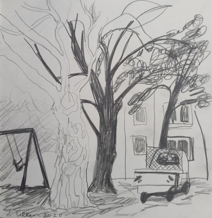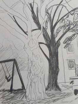 In meiner Zeichnung habe ich mit grober, lebendiger Bleistiftstrichführung gearbeitet, um die rohe und natürliche Atmosphäre eines alten, knorrigen Baumes neben einer Kinderschaukel festzuhalten. Dieses Bild fängt nicht nur die Stille des unbeachteten Moments ein, sondern betont auch den Kontrast zwischen der beständigen Natur und den flüchtigen Phasen der Kindheit. Es soll eine nostalgische Stimmung und eine tiefe Verbindung zur Natur in Ihrem Zuhause… schaffen.