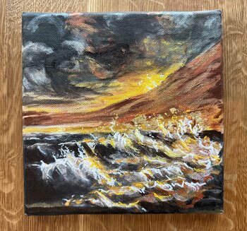 „Feuer über dem Wasser“ fängt den Moment ein, in dem Licht und Sturm aufeinandertreffen. Goldene Bruchstücke brechen durch die Dunkelheit, während die Wellen kraftvoll dagegenhalten. Ein Werk, das Naturgewalt und innere Aufbruchsstimmung in einem einzigen, leuchtenden Augenblick vereint. Entstanden ist das Werk aus dem Bedürfnis, innere Kraftmomente sichtbar zu machen: jene Augenblicke, in denen sich Dunkelheit und Licht begegnen und etwas Neues… aufbricht. Die Landschaft wurde für mich zum Spiegel eines inneren Prozesses – ein Dialog zwischen Unruhe, Mut und dem leuchtenden Kern, der bleibt.