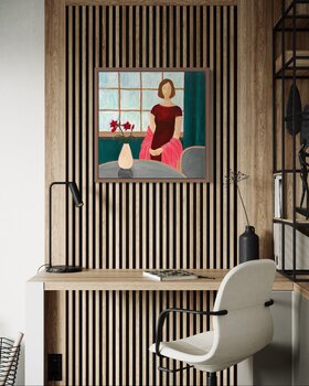 „The Unwanted Party“ ist ein gemaltes Porträt der Selbstbesinnung in einem sozialen Umfeld. Eine Frau, in einen weichen rosa Schal gehüllt, steht in einem Raum, in dem Licht sanft ihre Figur umhüllt. Sie ist anwesend, doch ihr Blick ist distanziert, als ob ihre Gedanken sie woanders hingeführt hätten. Tiefe Burgunder- und Grüntöne schaffen einen harmonischen Kontrast zwischen der Außenwelt und ihrem inneren Zustand und betonen emotionale Distanz.… Die roten Blumen auf dem Tisch fügen eine symbolische Ebene hinzu – das Leben geht um sie herum weiter, auch wenn sie nur beobachtet, ohne sich zu engagieren. Dieses Gemälde ist eine perfekte Ergänzung für einen Raum, in dem subtile, emotionale Kunst geschätzt wird.