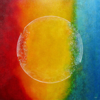 Nada Brahma 4 - bei diesem Werk nutze ich bewusst alle Grundfarben und teilweise auch deren Verläufe als Hintergrund für einen weißen Kreis. Dieser Kreis steht als Symbol einer Zelle oder eines Lebenskreises, für Schwingungen und Bewegungen - es darf gerne im Auge des Betrachters liegen, was dieses Klangbild für Sie symbolisiert. …