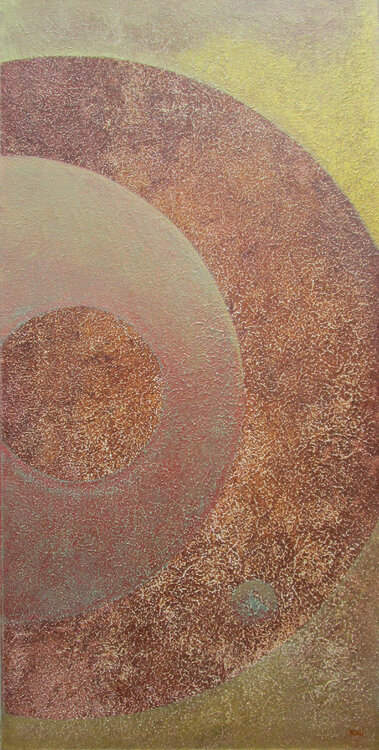 Roundabout 1 - mein neue Klangkomposition mit Kreisanordnungen in Metalltönen. Hierbei nutze ich Gold als Farbe der höchsten Schwingungsfrequenz und Spachtelmasse, um dem Werk Tiefe und Struktur zu verleihen. Als Symbol der Schwingungen und Klänge nutze ich Kreise, denn Kreise machen glücklich.