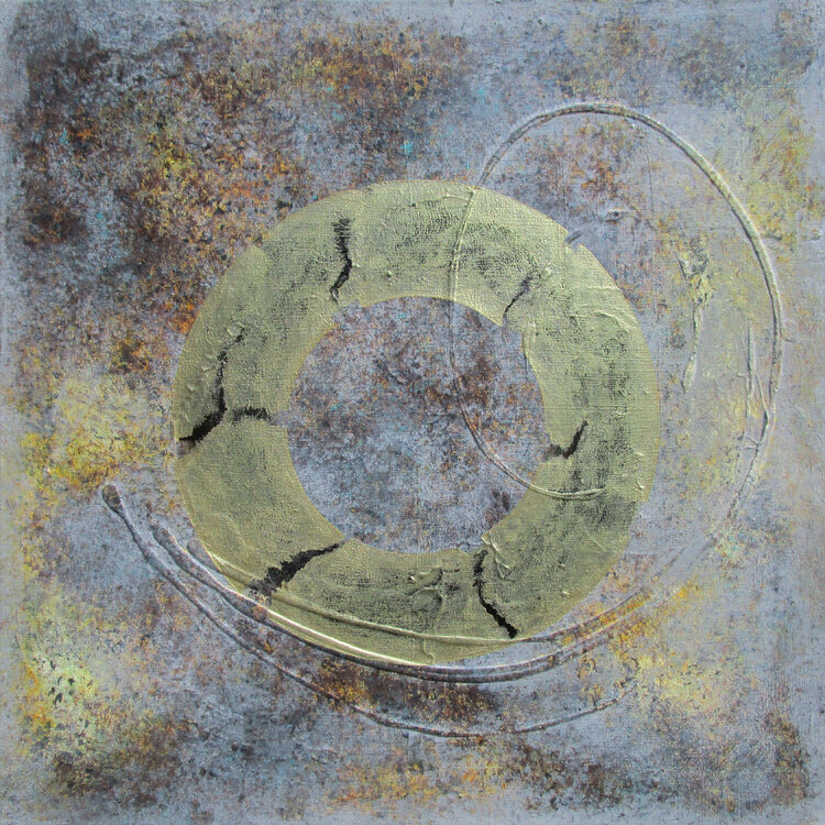 Zeitlos 1 - Zeitklang, das Rad der Zeit, schwingend in unserer gelebten festen Materie, Leichtigkeit in unseren starken, festen Strukturen. Wie in allen Bildern dieser Serie: das Darstellen von Zeitklängen in abstrahierten Flächen und geometrischen Formen auf stark ausgearbeiteten Hiintergründen.