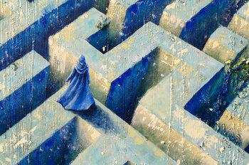 Das Werk präsentiert sich als Fragment eines schwebenden Blicks: Die strengen Formen des Labyrinths lösen sich in wechselnde Perspektiven auf, entziehen sich dem Blick und öffnen sich zu einem Horizont, der in schillerndem Licht gehüllt ist. Von oben betrachtet scheint alles geordnet, doch innerhalb dieses Netzes wird… jeder Schritt zur Entscheidung, jede Kreuzung zur Prüfung: eine Geste, die zur Befreiung oder zum ewigen Verlust führen kann.