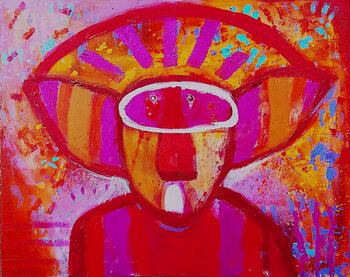 In diesem Werk wollte ich die urtümliche Kraft einfangen, die im Morgengrauen erwacht. Intensive Farben und ursprüngliche Formen vermitteln Energie und Lebendigkeit. Rot und Orange rufen Leidenschaft und Vitalität hervor, während türkisfarbene Akzente Hoffnung und Erneuerung bringen. Es ist ein symbolischer Wächter, der den Beginn eines neuen Tages beschützt und jeden Raum mit Geist, Präsenz und Kraft erfüllt.
