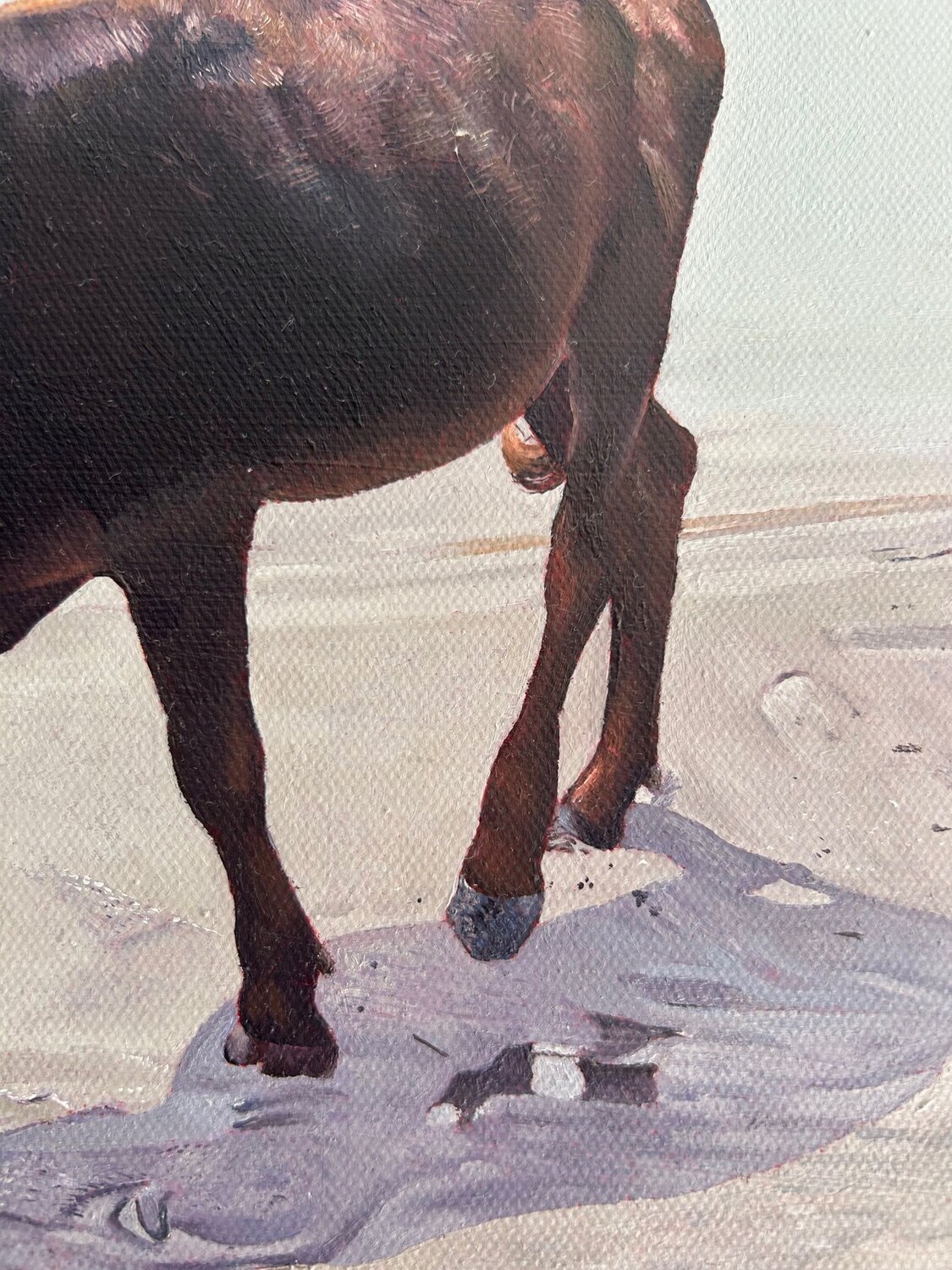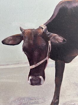 Ich male Emotionen, das heißt aber nicht, dass ich immer nur Menschen male. Es gibt auch andere Dinge, die Emotionen wecken,… und diese Szene hat mich zutiefst berührt. Mein Besuch auf Porar Char, einer winzigen, abgelegenen Insel in Bangladesch, öffnete mir die Augen für das Leid, das dort aufgrund des Klimawandels herrscht. Diese Insel war eine von vielen, die von Überschwemmungen bedroht waren. Bei einem herannahenden Sturm und den darauf folgenden Überschwemmungen musste die gesamte Insel evakuiert werden. Die Evakuierung umfasste alle Menschen, ihre Tiere und ihren gesamten Besitz. Der Sturm zog auf, die Kuh sollte gleich evakuiert werden.