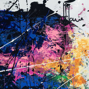 In dieser Arbeit aus der L-Serie male ich in einem Zustand vollkommener Freiheit und lasse Geste und Farbe ohne vorgefasste Ideen entstehen. Linien und Farbspritzer entstehen spontan, wie eine bildhafte Schrift, in der jeder Strich die Energie des Augenblicks und meinen inneren Zustand widerspiegelt. Diese Serie ist für mich ein Raum des Ausdrucks, frei von jeglichen Zwängen, in dem die Malerei zu einem direkten Spiegelbild meiner Gefühle und meiner… Fantasie wird.