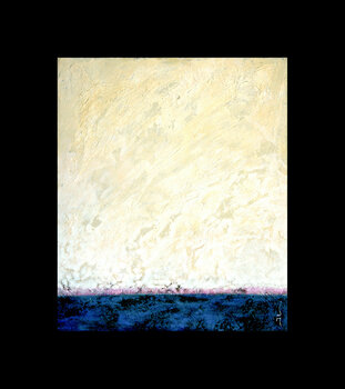 "Stract Sky" ist eine abstrakte Landschaft mit überwiegend elfenbeinfarbener Farbe, die am unteren Rand des Werks mit Dunkelblau und darüber mit einem dünnen hellroten Fries verziert ist.