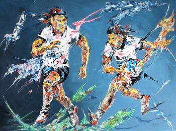 Mit diesem Gemälde wollte ich die Intensität und Leidenschaft des Inselrugbys durch dynamische Acrylfarben einfangen. Die semi-abstrakten Formen vermitteln die Schnelligkeit, Kraft und Energie der Spieler und fangen gleichzeitig den Geist und die Leidenschaft dieses Sports ein. Dieses Kunstwerk strahlt eine ansteckende Vitalität aus und ist ideal, um Ihrem Zuhause Kraft und Kampfgeist zu verleihen.