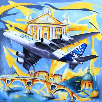 Der Airbus A380, das größte Passagierflugzeug der Welt, befindet sich hier im Herzen von Toulouse, aus dem er hervorgegangen ist. Wir erkennen das Capitole (Rathaus von Toulouse), den Pont Neuf und die Kuppel von La Grave. Dieses Flugzeug repräsentiert die stille Kraft und den Riesen der Luft.