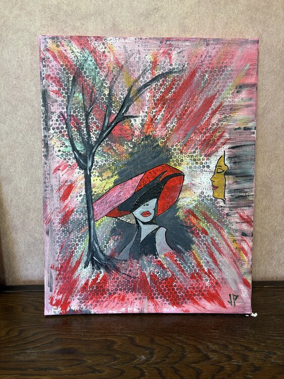 Dieses Werk entstand mit Acrylfarben, um einen Hauch von Leben einzufangen. Die semi-abstrakte Energie vereint Fließendes und Spannung und erinnert an eine geheimnisvolle Frau unter einem rauschenden Baum. Die leuchtenden Rottöne vibrieren vor Emotionen und vermitteln Wärme und Leidenschaft. Es ist eine Einladung, stille Stärke und Eleganz in den eigenen vier Wänden zu spüren.