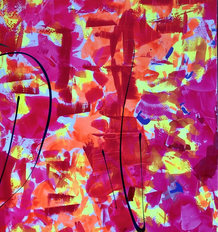 Schnelle, gestische Malstriche in Orange, Rot und Gelb erzeugen eine Flut positiver Emotionen, die auf eine zwei Quadratmeter große Leinwand springen – und jedem Raum Energie und Vitalität verleihen. Dieses Stück würde in einem Eingangsbereich großartig aussehen oder als Blickfang in einem Raum dienen, der einen farbigen Mittelpunkt braucht.