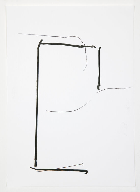 Diese Zeichnung erforscht Konzepte von Raum, Konstruktion und Leichtigkeit, Präzision und Dynamik. Die Oberfläche des Papiers hat die Gesten und Bewegungen eingefangen, die den Linien zugrunde liegen. Das Bild nimmt innerhalb dieses Gleichgewichts Gestalt an.