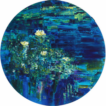 Mit diesem Gemälde hatte Joëlle Kem Lika Spaß daran, Materialeffekte zu erzielen, indem sie Glasuren in transparenten oder undurchsichtigen Farben mit von ihr selbst erstellten Plexiglasmessern und Schabern und für diese Reflexionen im Wasser herstellte. Harmonie eher in Blau, Türkis für Lichtblitze, Lila und Gelbgrün. Harmonie ganz in Weichheit, mit diesem Gefühl des Lebens, das überall pulsiert… ... Wasser ... Blume ... Licht ...