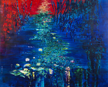 ... im Schatten eines Unterholzes ... das Gold der Sonne durchdringt wie ein Innenlicht und manifestiert diesen dem Künstler so wertvollen "Lebensimpuls". Blau-, Gelb-, Grün-, Türkis- und Purpurtöne vermischen sich und ziehen das Gemälde in Richtung Abstraktion. Farbe trumpft auf. Die Farbwahrnehmung geht der Bedeutung voraus, die Künstlerin… spielt mit dieser Spannung zwischen Empfindung und Interpretation, Abstraktion und Figurativem.