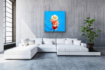 In dieser Arbeit habe ich versucht, die Essenz eines flüchtigen Moments der Freiheit und Gelassenheit einzufangen. Die Verwendung von Öl verleiht dem türkisfarbenen Wasser eine reiche Textur und Tiefe, die einen Kontrast zur Weichheit des Strohhuts und des vom Wind zerzausten goldenen Haares bildet. Ich habe Expressionismus mit Impressionismus verschmolzen, um nicht nur den Anblick dieses nackten Rückens beim Eintauchen in einen Pool hervorzurufen,… sondern auch das Gefühl absoluter Ruhe. Dieses Gemälde lädt zu einem Gefühl der Ruhe und Träumerei ein und ist perfekt geeignet, um jedem Raum einen Hauch von Frieden und Entspannung zu verleihen.