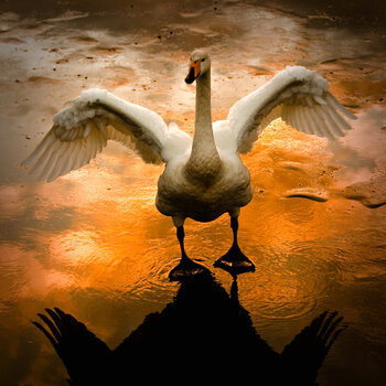 In diesem digitalen Foto habe ich einen Moment purer, majestätischer Selbstsicherheit eines Schwans vor einem feurigen Wasserhintergrund festgehalten. Die ausgebreiteten Flügel und die imposante Haltung des Schwans inmitten der reflektierenden goldenen Farbtöne rufen ein mitreißendes Gefühl von Erwachen und Widerstandskraft hervor. Dieses Stück strahlt eine dynamische Energie aus, wertet jeden Raum mit seinem kühnen Geist und seiner erhellenden Präsenz… auf und ermutigt den Betrachter, Stärke und Anmut in sein eigenes Leben zu integrieren.