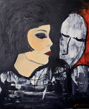 In diesem Bild, betitelt "Die Dame und die Maske", habe ich mit Acrylfarben eine Szene voller Emotion und Mysterium festgehalten. Der figurative und zugleich vintage Stil porträtiert eine elegante Dame in tiefem Schwarz-Weiß Kontrast, die einer geheimnisvollen, maskenhaften Gestalt gegenübersteht. Das Werk spiegelt die Dualität zwischen dem, was wir zeigen und dem, was wir verbergen. Die intensiven, dunklen Farbtöne und das dramatische Spiel von… Licht und Schatten bringen eine fesselnde Energie in jeden Raum, fordern den Betrachter heraus und regen zum Nachdenken an.