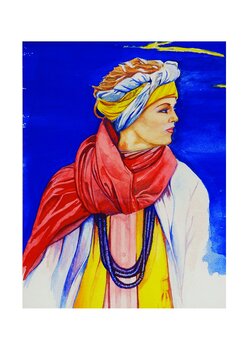 In diesem Werk habe ich einen Moment stiller Stärke und lebendiger Lebensfreude eingefangen. Mit kräftigen Farben und fließenden Linien wollte ich Stolz und Widerstandskraft vermitteln. Der tiefrote Schal symbolisiert Leidenschaft und Wärme, während ihr ruhiger Blick Selbstvertrauen und Anmut ausstrahlt. Dieses Kunstwerk strahlt Energie und Tiefe aus und inspiriert jeden, der es in seinem Zuhause aufnimmt. Es ist eines meiner Lieblingswerke, und… meine Frau erlaubt mir nicht, das Original zu verkaufen.