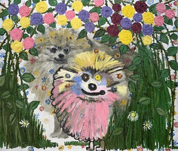 Vor Kurzem habe ich begonnen, ältere Werke wieder aufzugreifen – zum Beispiel habe ich einer Zwergspitz-Zeichnung von 2014 einen Cartoon-Hund aus… dem Multiversum von 2025 hinzugefügt. Dieser Prozess, vergessene Werke wiederzubeleben, fühlt sich an wie die Pflege eines Haustiers – zärtlich und notwendig. Er verleiht vergangenen Werken neue Relevanz und Energie.