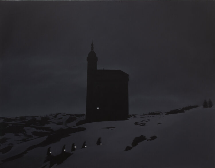 Dieses Gemälde zeigt ein abgelegenes, ernstes Gebäude vor einer in die Dämmerung getauchten Landschaft. Sein Minimalismus unterstreicht den Kontrast zwischen der alles verschlingenden Dunkelheit und dem einzelnen Licht, das vom Gebäude ausstrahlt und Hoffnung und Widerstandskraft in der Isolation symbolisiert. Das mit Öl auf Leinwand gemalte Kunstwerk verkörpert Realismus mit emotionaler Tiefe und bietet einen subtilen, aber kraftvollen Ausdruck… der Beständigkeit in trostlosen Zeiten.