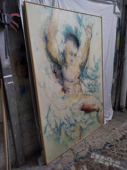 In dieser Arbeit, die in gemischter Technik an Bord hergestellt wurde, können Sie in dieser Arbeit die Korrekturen der Körper- und Kopfhaltung sehen, die der Autor nicht gelöscht hat, wodurch ein Gefühl der Bewegung im Fall von Ikarus entsteht, der in seine Flügel gehüllt ist, zerstört durch die Hitze der Sonne